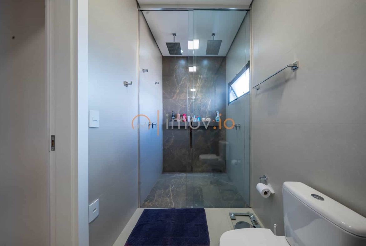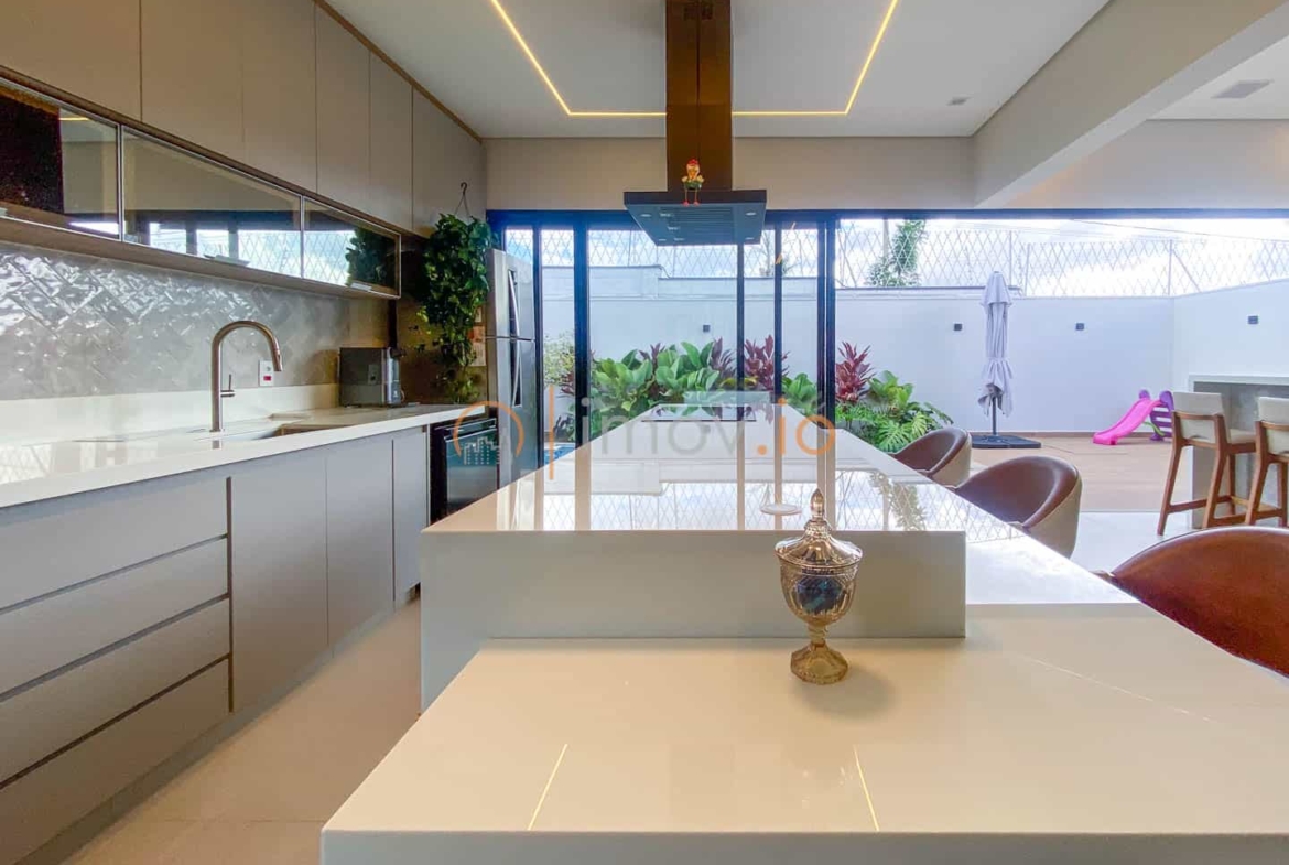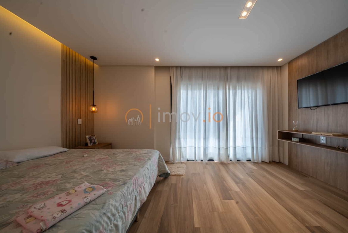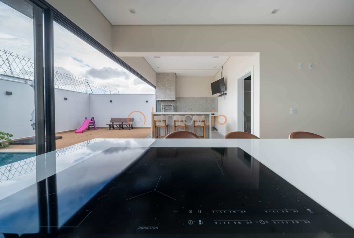 A cozinha com ilha em nanoglass vira ponto de encontro. É ali que o café da manhã acontece corrido antes da escola, que as tarefas são feitas na bancada, que o fim de semana começa com conversa e risada. E quando as portas de vidro se abrem, o lazer aparece como extensão da casa: varanda gourmet, churrasqueira a carvão e uma piscina aquecida com hidromassagem e cascata — um convite para desacelerar no final do dia.