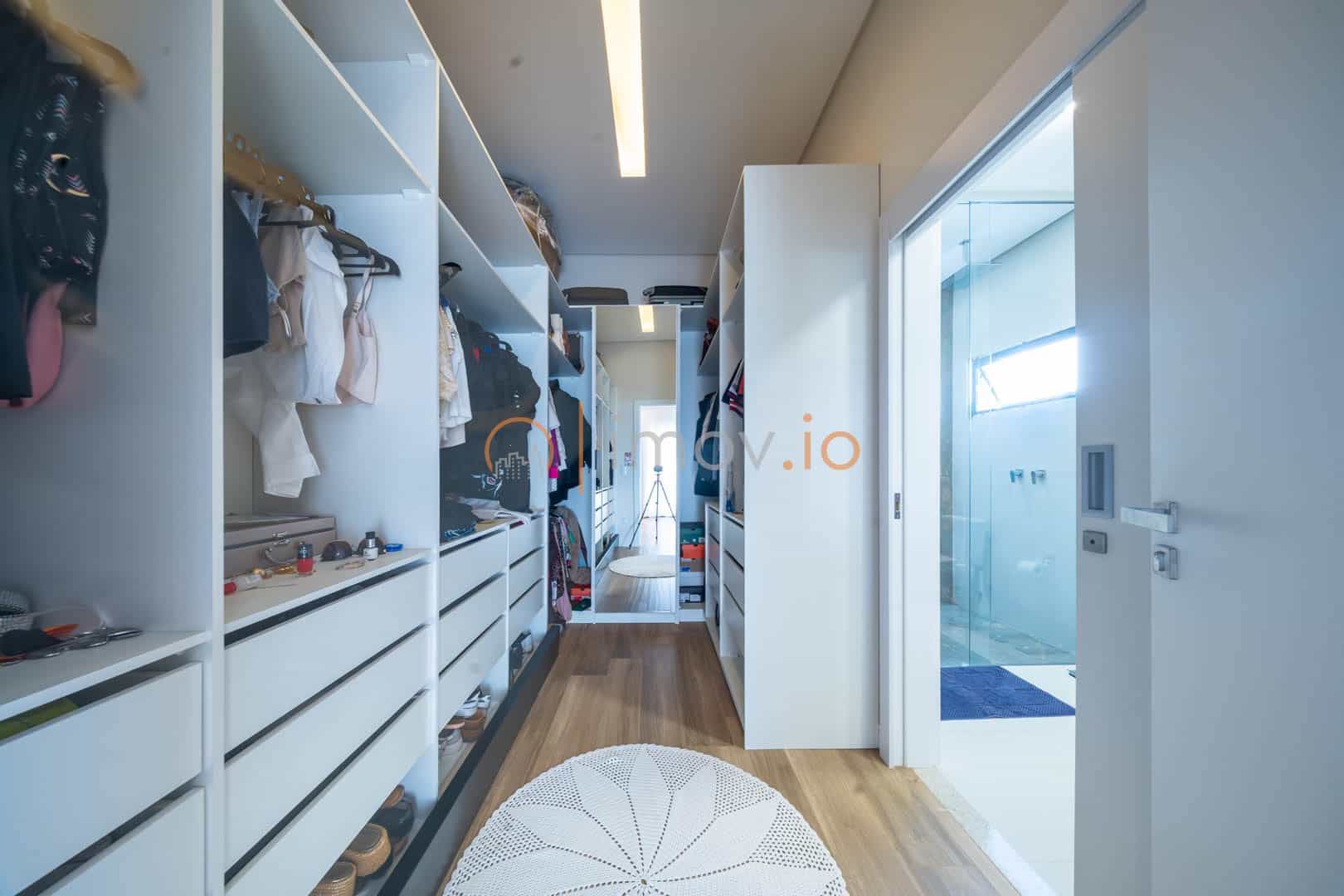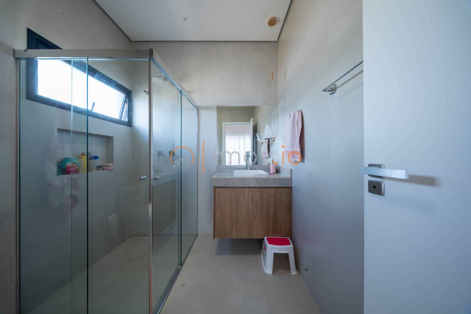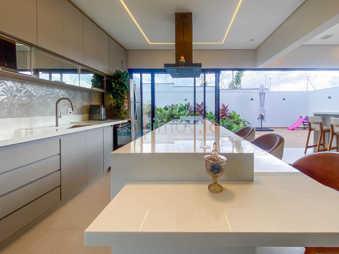 A cozinha com ilha em nanoglass vira ponto de encontro. É ali que o café da manhã acontece corrido antes da escola, que as tarefas são feitas na bancada, que o fim de semana começa com conversa e risada. E quando as portas de vidro se abrem, o lazer aparece como extensão da casa: varanda gourmet, churrasqueira a carvão e uma piscina aquecida com hidromassagem e cascata — um convite para desacelerar no final do dia.
