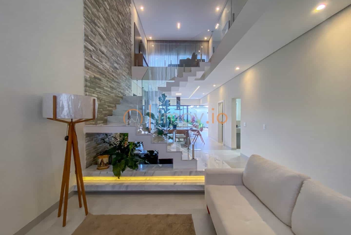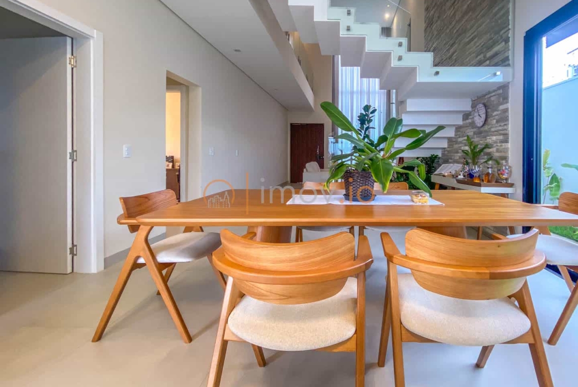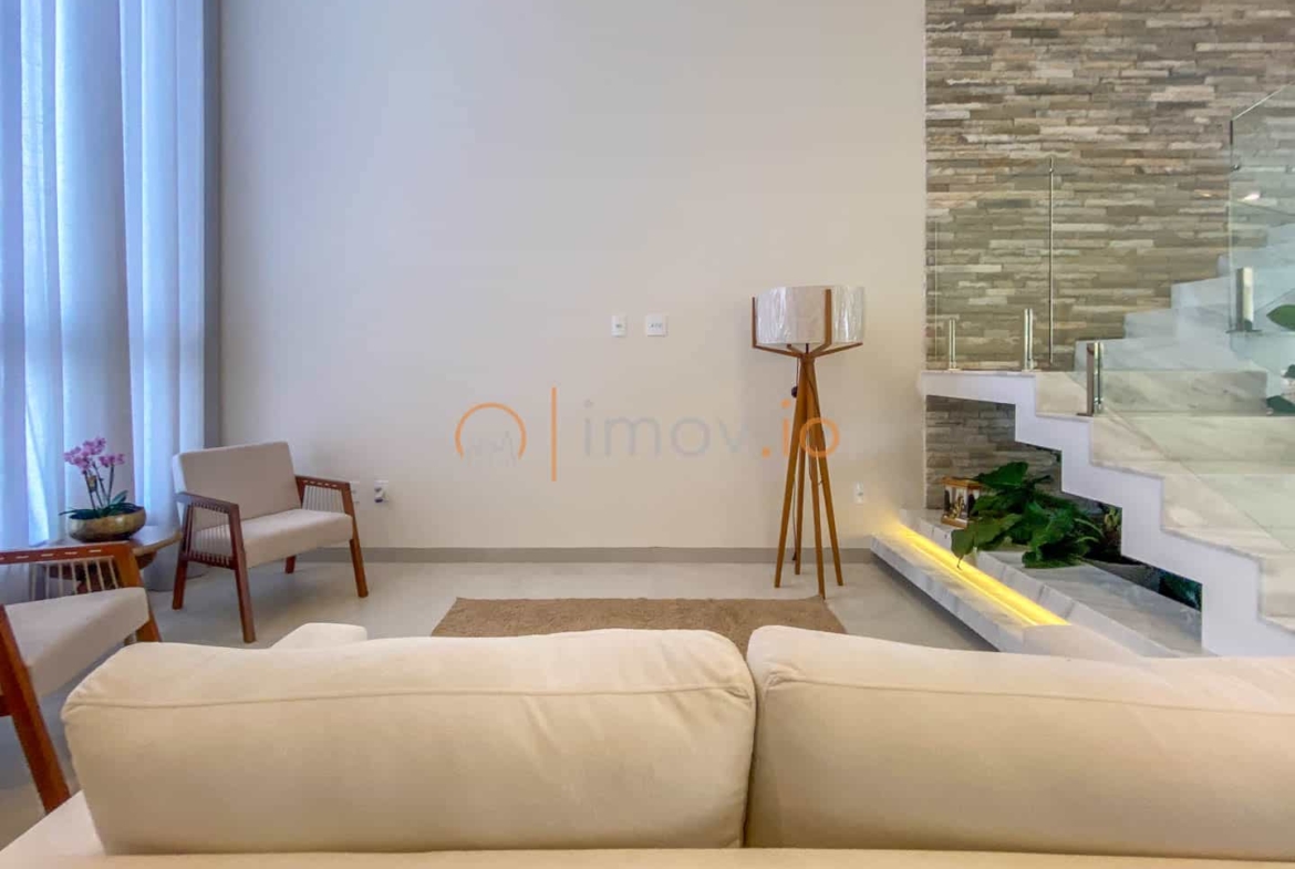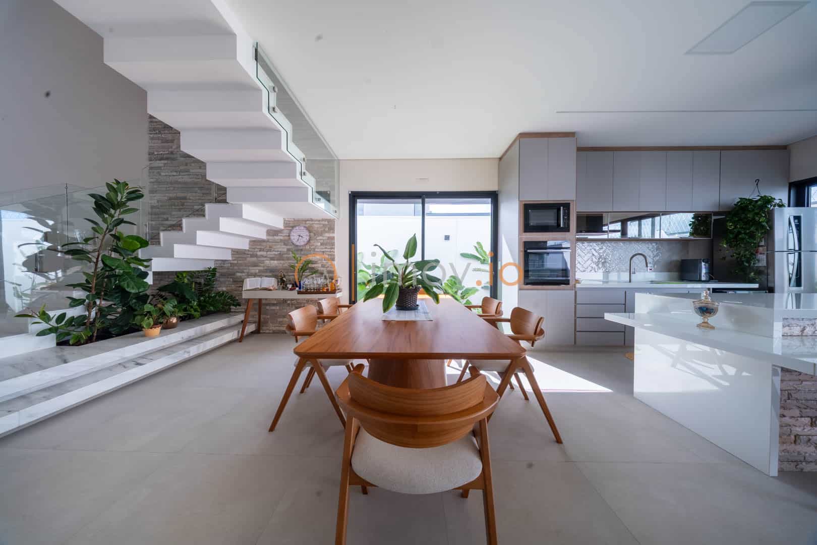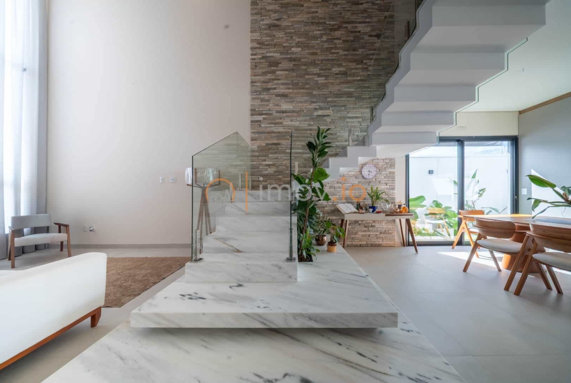 Ao entrar, o pé-direito duplo não é apenas um detalhe estético — ele traz luz, amplitude e aquela sensação de que a casa respira junto com você. A escada em mármore, com guarda-corpo em vidro, parece flutuar e conecta os ambientes sem pesar. Tudo é integrado de forma natural: sala de estar, jantar e cozinha conversam entre si, criando um espaço perfeito para receber amigos ou simplesmente acompanhar as crianças enquanto o jantar fica pronto.
