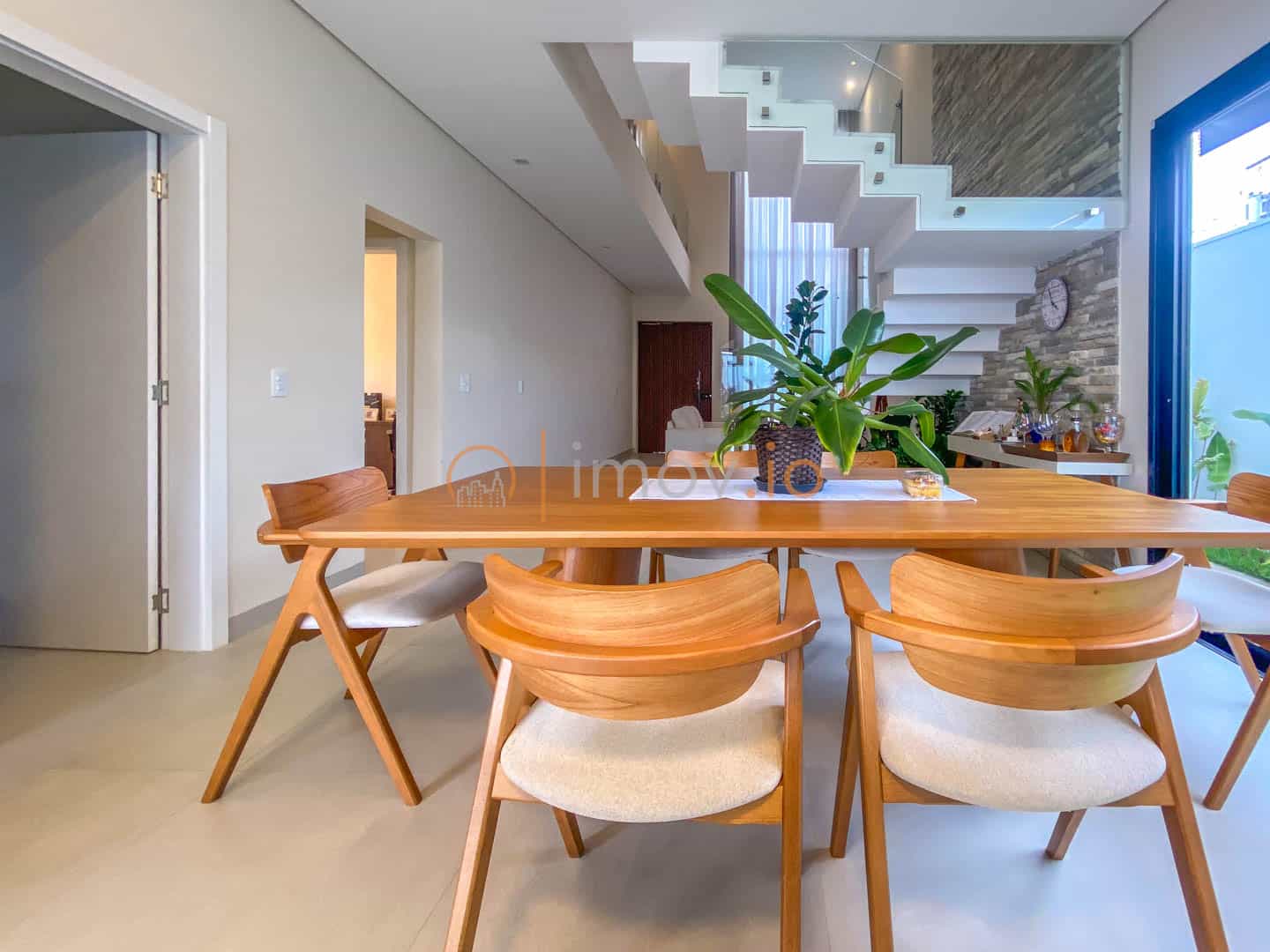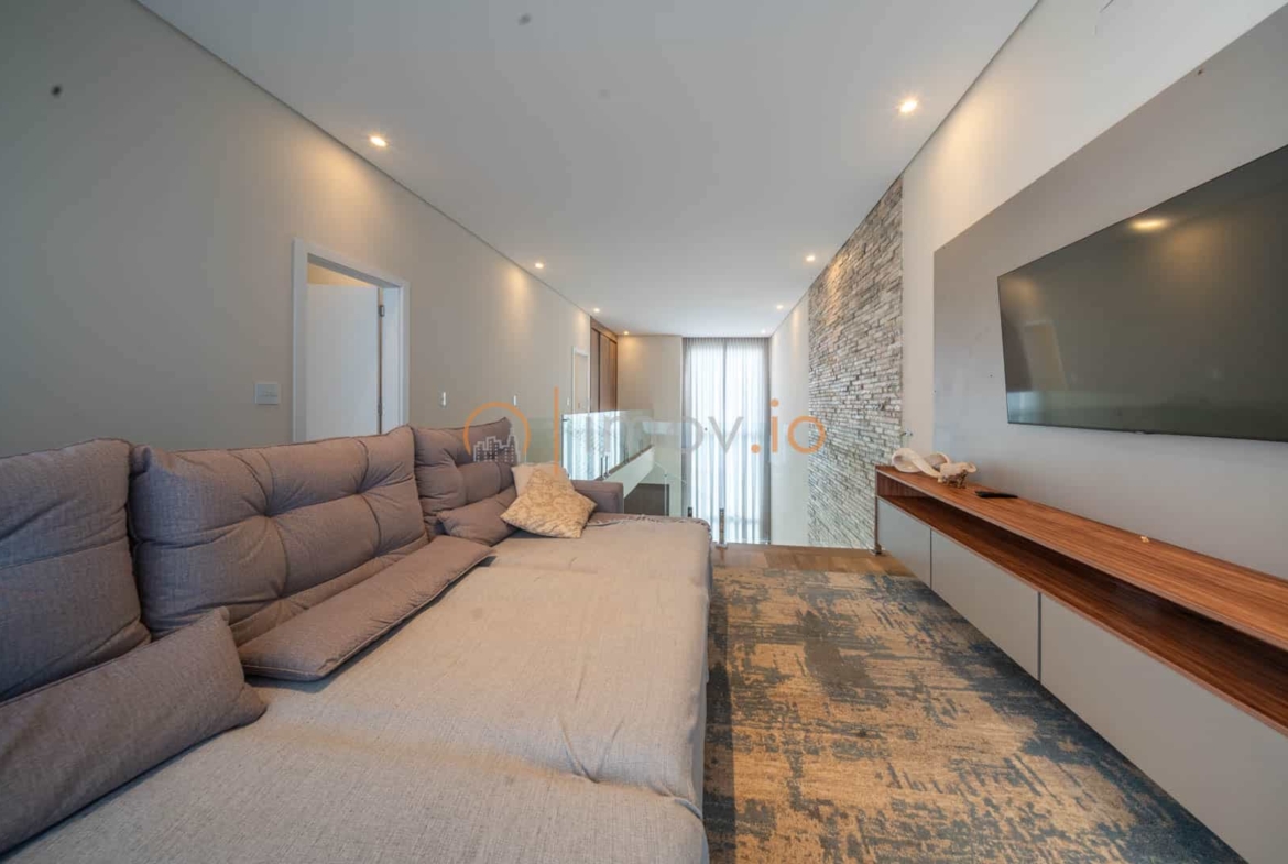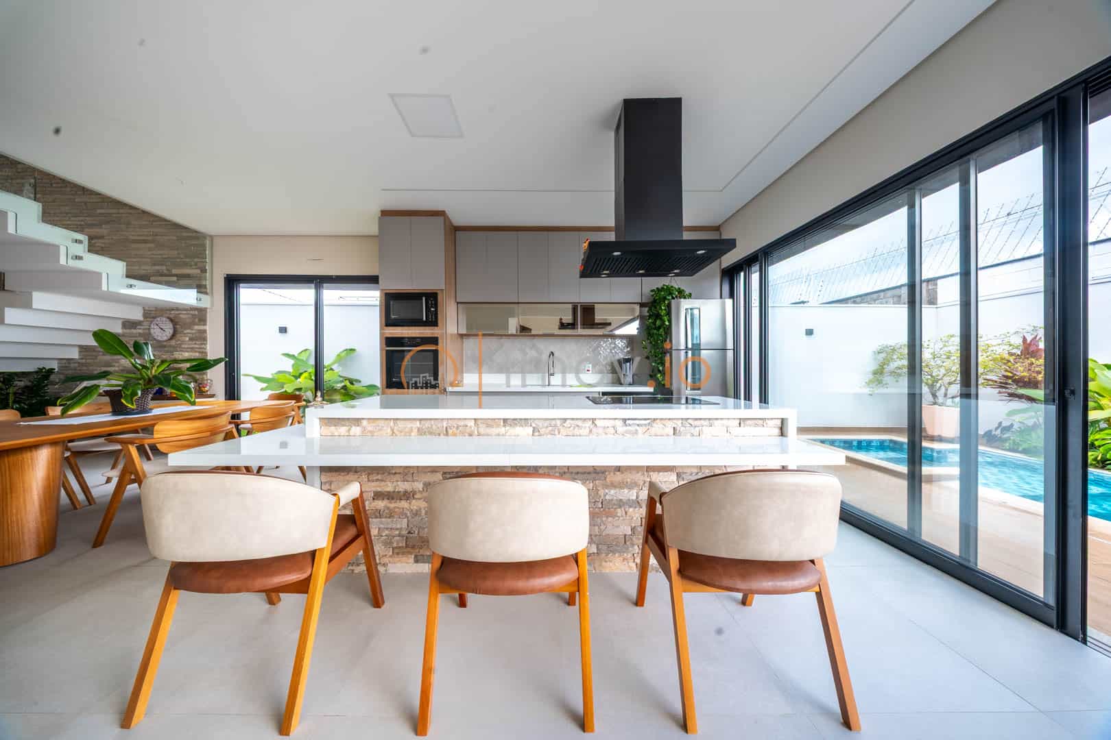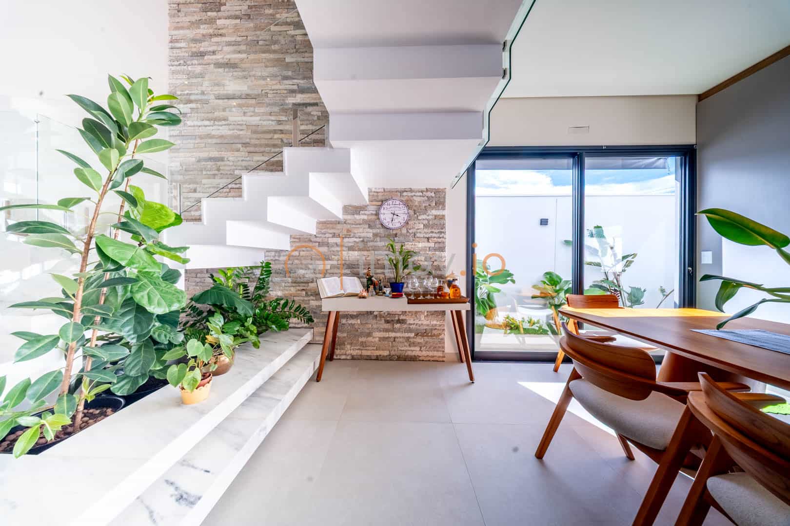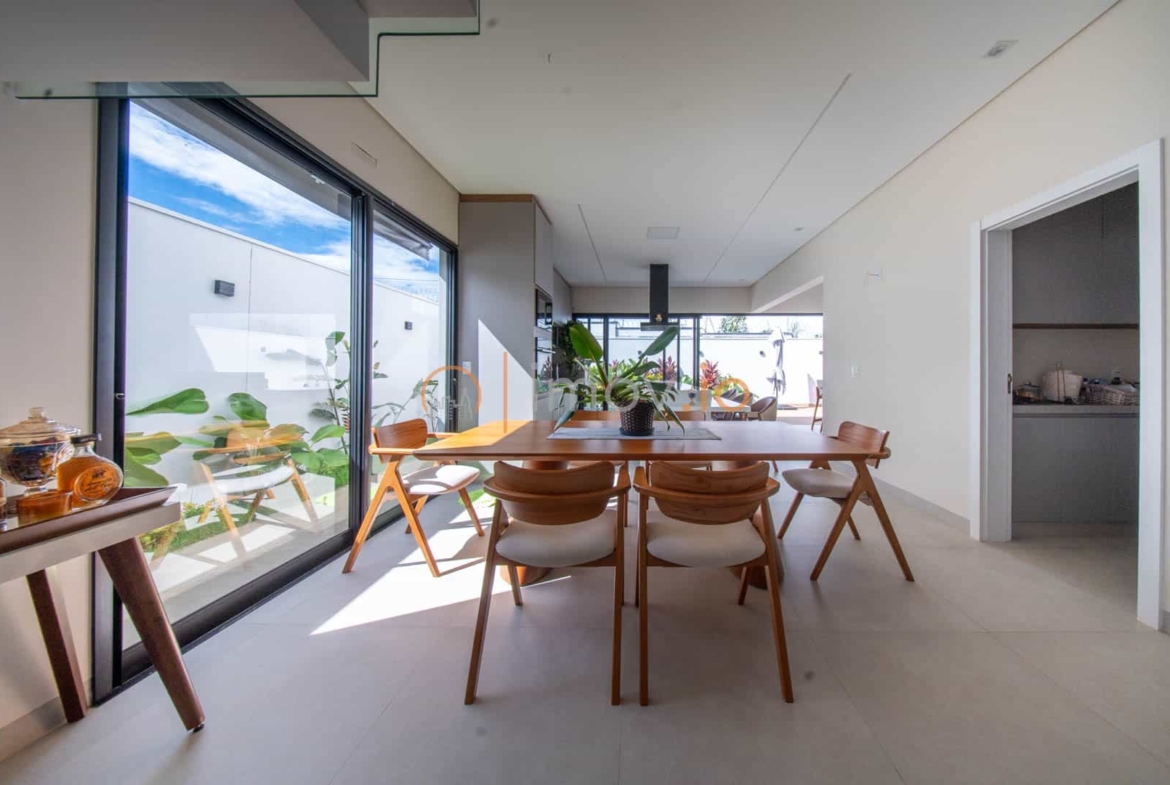 Ao entrar, o pé-direito duplo não é apenas um detalhe estético — ele traz luz, amplitude e aquela sensação de que a casa respira junto com você. A escada em mármore, com guarda-corpo em vidro, parece flutuar e conecta os ambientes sem pesar. Tudo é integrado de forma natural: sala de estar, jantar e cozinha conversam entre si, criando um espaço perfeito para receber amigos ou simplesmente acompanhar as crianças enquanto o jantar fica pronto.
